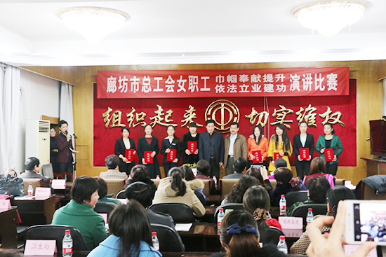 比賽開始前,市總工會常務副主席關景發致辭;比賽結束后市文廣新局黨組副書記李克儉點評。廊坊市人大常委會副主任、市總工會主席畢曉明,市總工會副主席田慧蘭,中太建設集團黨委副書記、工會主席鐘崇鶴等人為獲得獎頒獎,并合影留念。