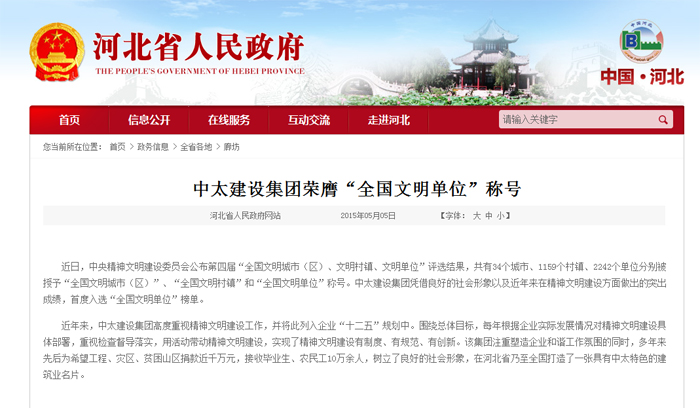 河北省人民政府網(wǎng)站報道了中太建設集團榮膺“全國文明單位”稱號