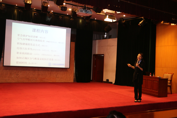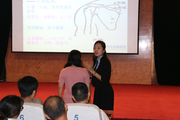 在中國環(huán)境健康與衛(wèi)生安全促進(jìn)會河北分會的大力支持下,中國安全健康教育中心河北站特邀講師,全民健康咨詢服務(wù)部,省健康教育專業(yè)委員會委員,宣傳科講師彭一茹走進(jìn)中太大廈,圍繞CPR現(xiàn)場緊急救護(hù)知識;環(huán)境污染、室內(nèi)污染的危害及防護(hù)知識;經(jīng)絡(luò)穴位養(yǎng)生;常見職業(yè)病的防治;家庭醫(yī)療設(shè)備的正確區(qū)分等內(nèi)容,從實際案例出發(fā),深入淺出、形象生動的剖析健康的重要性以及穴位養(yǎng)生保健的方法,同時還邀請現(xiàn)場員工代表上臺,與老師合作為現(xiàn)場員工形象的解析了經(jīng)絡(luò)穴位治療的原理及療效。彭一如老師的精彩授課得到了在場員工的一致認(rèn)可。