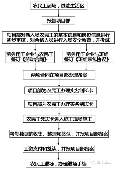 一、公司成立勞務(wù)管理中心,加強(qiáng)各相關(guān)職能部門的監(jiān)督與協(xié)作;分公司參照公司勞務(wù)管理中心機(jī)構(gòu)和人員配置,必須成立分公司勞務(wù)管理中心,并配備勞務(wù)中心主任和相應(yīng)的管理人員。主任:公司分管勞務(wù)領(lǐng)導(dǎo) 組員:公司經(jīng)濟(jì)管理部、財(cái)務(wù)部、安全管理部、質(zhì)量技術(shù)部、法律事務(wù)部、政工部等部門負(fù)責(zé)人,公司勞務(wù)管理員、分公司勞務(wù)管理中心主任,各項(xiàng)目部。 項(xiàng)目部勞務(wù)管理機(jī)構(gòu)項(xiàng)目經(jīng)理部必須成立勞務(wù)管理領(lǐng)導(dǎo)小組,項(xiàng)目部勞務(wù)管理領(lǐng)導(dǎo)小組主要人員設(shè)置及要求如下:1、項(xiàng)目經(jīng)理為項(xiàng)目勞務(wù)管理工作的第一責(zé)任人。2、項(xiàng)目部必須設(shè)置一名副職以上人員作為勞務(wù)管理工作的第二責(zé)任人,其專職或兼職主管勞務(wù)日常管理工作。3、項(xiàng)目部使用勞務(wù)分包企業(yè)人員500人以上,必須設(shè)置專職勞務(wù)管理員1-4名;500人以下100人以上,必須設(shè)置至少1名專職勞務(wù)管理員;100人以下必須設(shè)置兼職勞務(wù)管理人員。 勞務(wù)管理員的薪酬不低于項(xiàng)目責(zé)任工程師的薪酬標(biāo)準(zhǔn)。4、項(xiàng)目勞務(wù)管理不只是勞務(wù)管理員的職責(zé),項(xiàng)目部相關(guān)部門必須直接參與勞務(wù)日常管理工作;各項(xiàng)目部根據(jù)項(xiàng)目實(shí)際情況,編制《項(xiàng)目勞務(wù)管理方案》,根據(jù)各項(xiàng)任務(wù)分解,方案中必須明確勞務(wù)管理領(lǐng)導(dǎo)小組成員和崗位職責(zé),以及應(yīng)急預(yù)案。5、勞務(wù)分包合同中須明確約定現(xiàn)場(chǎng)各分包隊(duì)伍必須設(shè)置一名以上專職勞務(wù)管理員。一、做好農(nóng)民工進(jìn)場(chǎng)施工前的各項(xiàng)手續(xù)1、如何做到勞務(wù)分包隊(duì)伍自覺(jué)向項(xiàng)目部申報(bào)施工人員進(jìn)場(chǎng)情況的關(guān)鍵是:現(xiàn)場(chǎng)封閉管理——沒(méi)有按規(guī)定辦理手續(xù)堅(jiān)決不能進(jìn)入施工現(xiàn)場(chǎng)。2、七天內(nèi)辦理好以下相關(guān)手續(xù),考慮到現(xiàn)場(chǎng)施工和減少作業(yè)人員等待時(shí)間的需要,可以優(yōu)先上報(bào)花名冊(cè)和辦理IC卡,但其他手續(xù)辦理完成以7天為管理底線。3、《勞動(dòng)合同》是國(guó)家《勞動(dòng)合同法》明文規(guī)定要簽訂的,但建筑行業(yè)農(nóng)民工群體執(zhí)行普遍不好,但涉及到勞務(wù)糾紛時(shí),政府是依照《勞動(dòng)合同》辦理。《班組承包協(xié)議》不同于集體合同,是民間行為,目前階段以及政府為了維穩(wěn),該協(xié)議是不受法律保護(hù)的,但大部分老板與作業(yè)人員在建立相互信任、協(xié)商的基礎(chǔ)上,基本上都是按照班組承包協(xié)議辦理結(jié)算。4、安全入場(chǎng)教育及考試等也是《勞動(dòng)合同法》中要求施工企業(yè)做到的 。