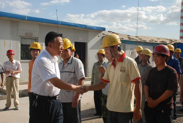6月30日下午,市人大副主任、總工會主席王瑞峰代表市總工會來到集團九公司“龍河盛都”項目施工現場,看望慰問在炎熱酷暑下,仍然堅持施工的一線工人,并送來了白糖、毛巾、綠豆、礦泉水等防暑降溫慰問物品。市總工會黨組書記、常務副主席關景發、副主席王泰山、市建設局工會主任王克峰等領導同志和集團工會主席鐘崇鶴、建設集團副總經理林維生陪同慰問。