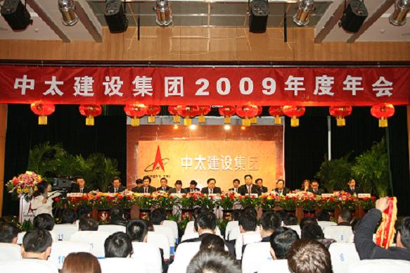 128,中太建設集團2009年年會在中太大廈二樓報告廳隆重召開。集團董事局成員,監事會成員,執行層成員,各工程局,外埠各分公司、子公司的董事長、經理、專職支部書記,廊坊區域分公司、子公司的董事長、經理、副經理、書記等,建設集團機關全體人員,2009年度受集團表彰的先進單位代表、先進個人共計300余人出席年會。