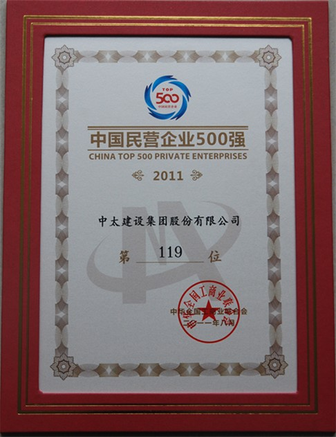 8月25日上午,全國工商聯(lián)在北京召開2011中國民營企業(yè)500強(qiáng)發(fā)布會(huì),發(fā)布2011中國民營企業(yè)500強(qiáng)、2011中國民營企業(yè)制造業(yè)500強(qiáng)名單以及2011中國民營企業(yè)500強(qiáng)分析報(bào)告。中太建設(shè)集團(tuán)以1,527,046萬元的營業(yè)收入業(yè)績,排名2011中國民營企業(yè)500強(qiáng)第119位。在河北省民營企業(yè)建筑業(yè)中位列第一。