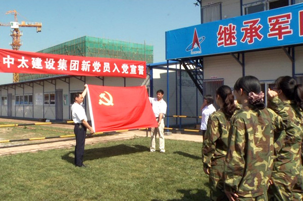 73上午9點,中太建設集團黨委在安瑞科項目工地舉行新黨員入黨宣誓儀式。在鮮紅的中國共產黨黨旗面前, 16名新黨員整齊排列成行,舉起右手,握拳過肩,莊嚴宣誓,表達了為共產主義事業奮斗終身的決心。集團黨委副書記鐘崇鶴參加宣誓儀式并講話。他代表集團黨委向全體新黨員表示祝賀,并提出了明確的要求和希望。他希望新黨員同志們不要辜負黨組織的期望,牢記入黨誓言,牢記全心全意為人民服務的宗旨,發揚黨的優良傳統和作風,在“創先爭優”活動中,在各自的工作崗位上,熱愛本職、學習本領,努力工作,發揮好黨員的先鋒模范帶頭作用,為黨的事業和中太的發展做出自己新的、更大的貢獻,以更加優異的成績,喜迎黨的十八大的勝利召開,無愧于共產黨員的光榮稱號!
