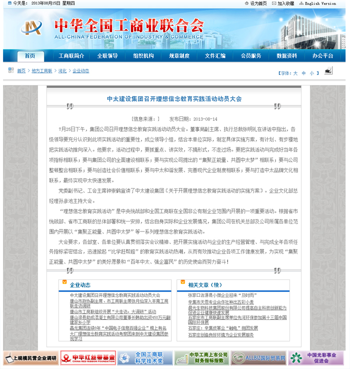 | 全國工商聯(lián)網(wǎng)站8月14日報(bào)道了中太建設(shè)集團(tuán)召開理想信念教育實(shí)踐活動動員大會 |
