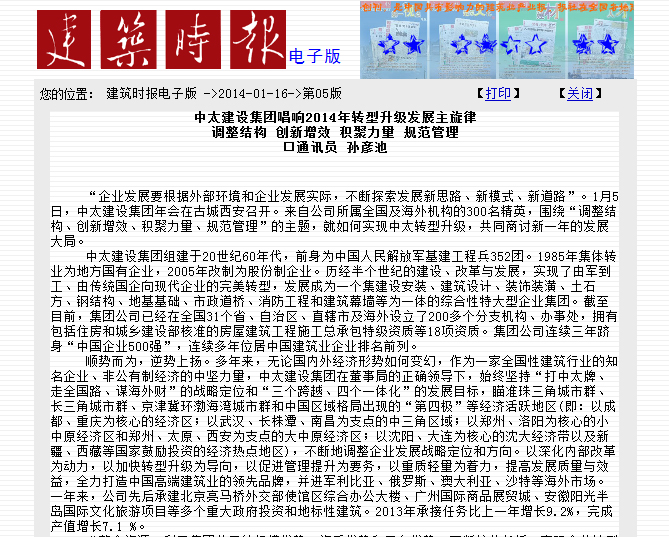 建筑時報2014年1月16日報道了中太建設集團唱響2014年轉型升級發(fā)展主旋律