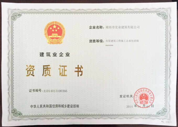 4月3日,經國家住房和城鄉建設部核準,中太建設集團股份有限公司控股子公司廊坊市宏業建筑有限公司正式晉升為房屋建筑工程施工總承包壹級資質。